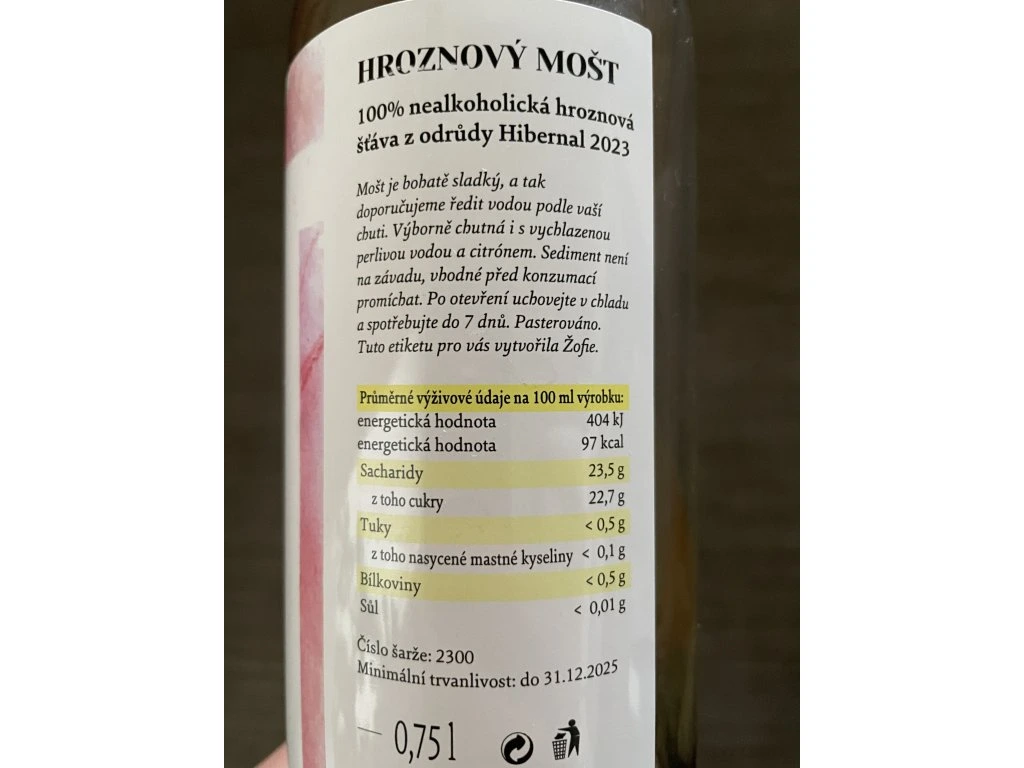 100% nealkoholická hroznová šťáva z odrůdy Hibernal